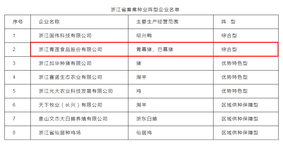 9月14日,浙江省農業農村廳、浙江省科學技術廳公布了浙江省種業陣型企業名單,其中浙江青蓮食品股份有限公司被認定為省畜禽種業綜合性陣型企業。